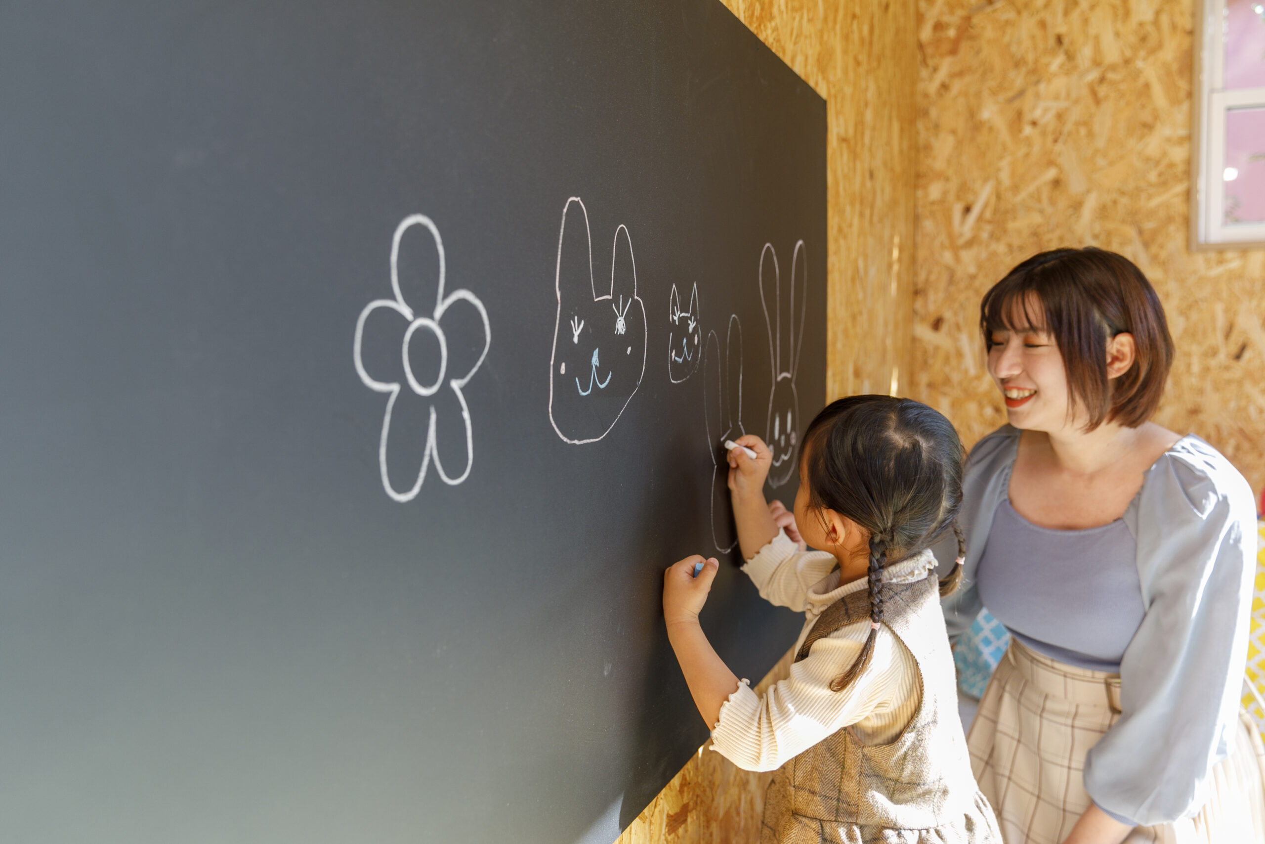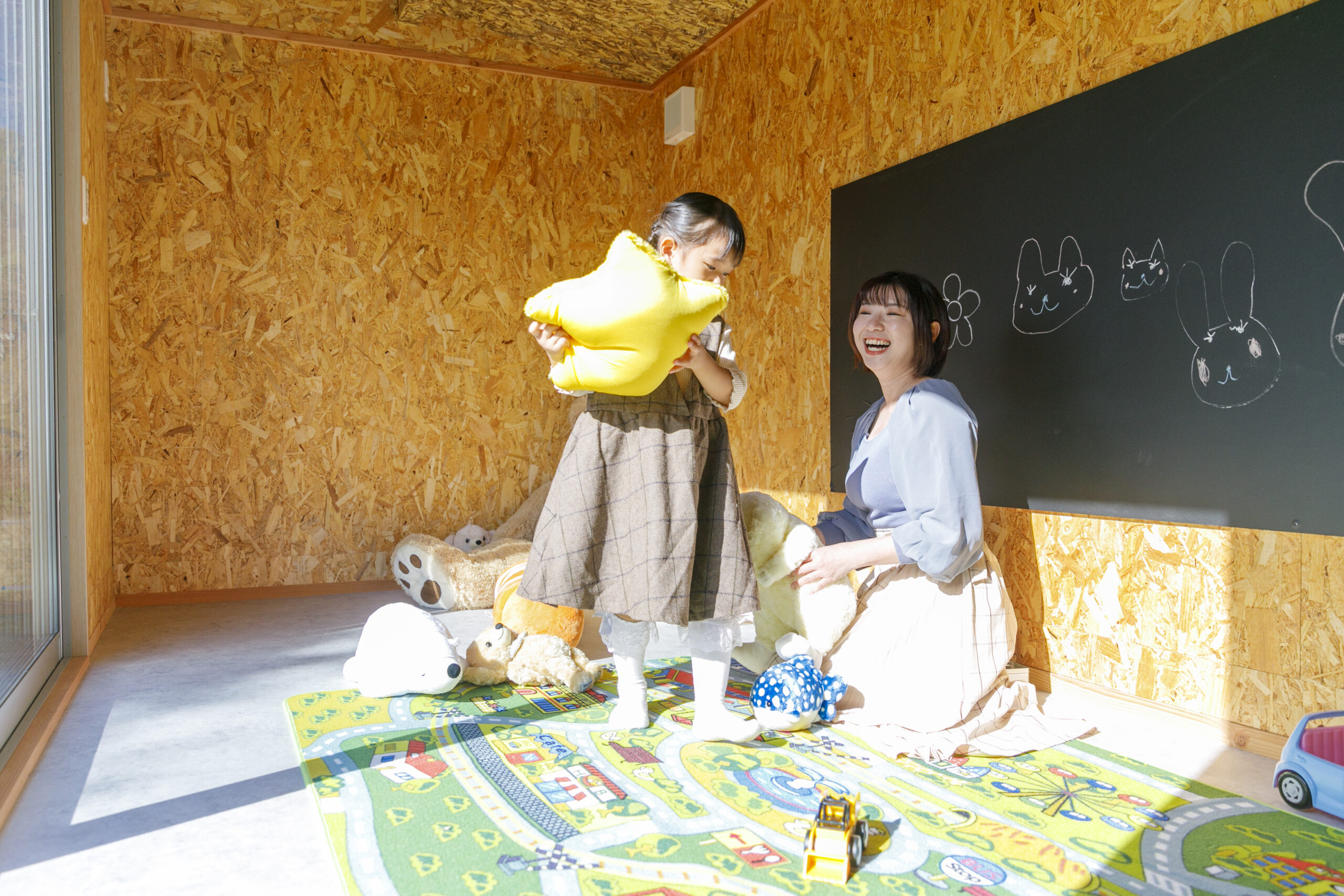 室内は「子どもとのびのび遊べる空間」をテーマにコーディネートしました。壁にはOSBボードを採用し、黒板シートで自由にお絵描きが楽しめます。家具を置かず広々とした空間に仕上げ、成長後は勉強部屋としても活用可能です。おもちゃやぬいぐるみに囲まれた安心感のある、家族の時間を大切にした一棟です。