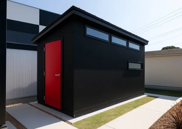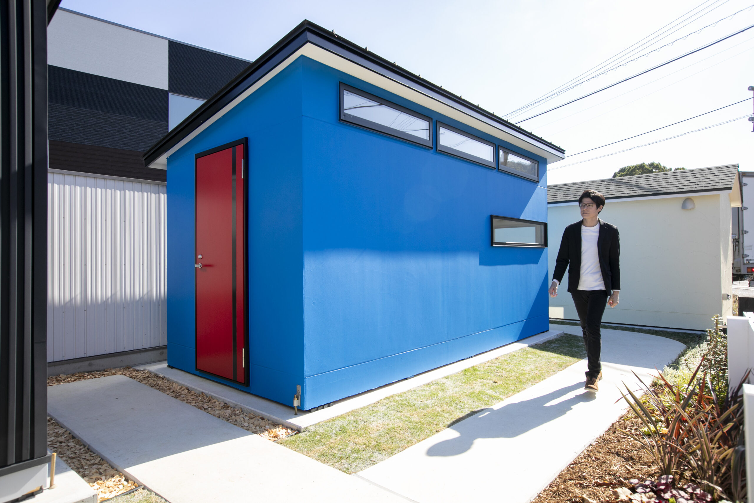 「ポトス」は、書斎や事務所として活用できる空間をコンセプトに設計したモデルです。片流れ屋根と配置にこだわった窓が特徴で、プライバシーに配慮しながらも自然光を取り入れられるデザインとなっています。外観の色決めには特に悩み、黒や青を試した後、現在の黄色に落ち着きました。塗り替えが可能なコテ塗り塗装の特徴を活かした一棟です。