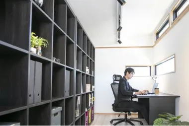 室内は男性スタッフの意見を取り入れながら、作業に集中できる環境を意識してコーディネートしました。クロスや床は落ち着いた色合いで統一し、棚や机などの家具を黒で揃えることで空間全体にまとまりを持たせています。ベッドやソファーを取り入れることで、休憩を挟みながら効率的に作業できるスタイルにアレンジすることも可能です。